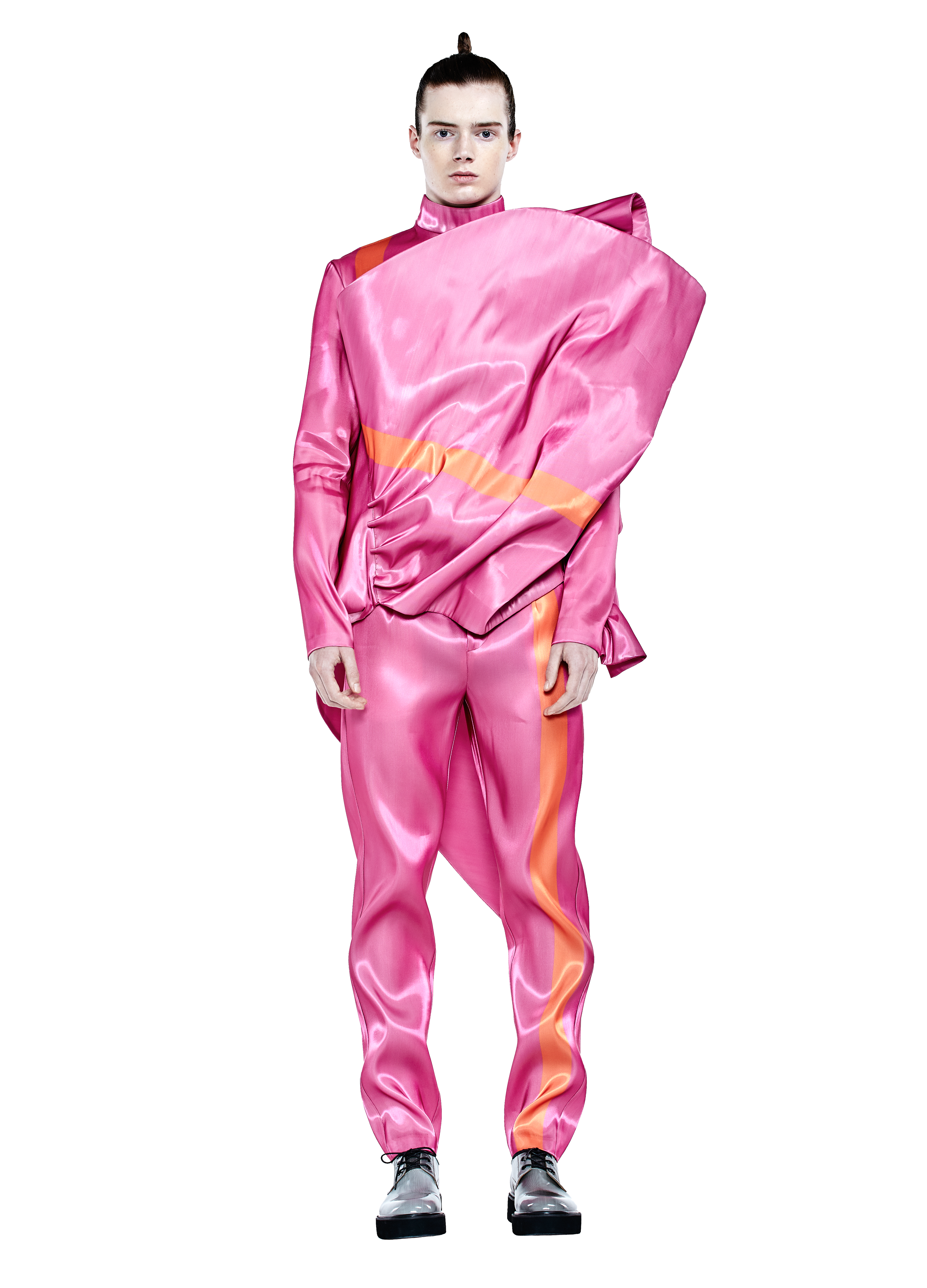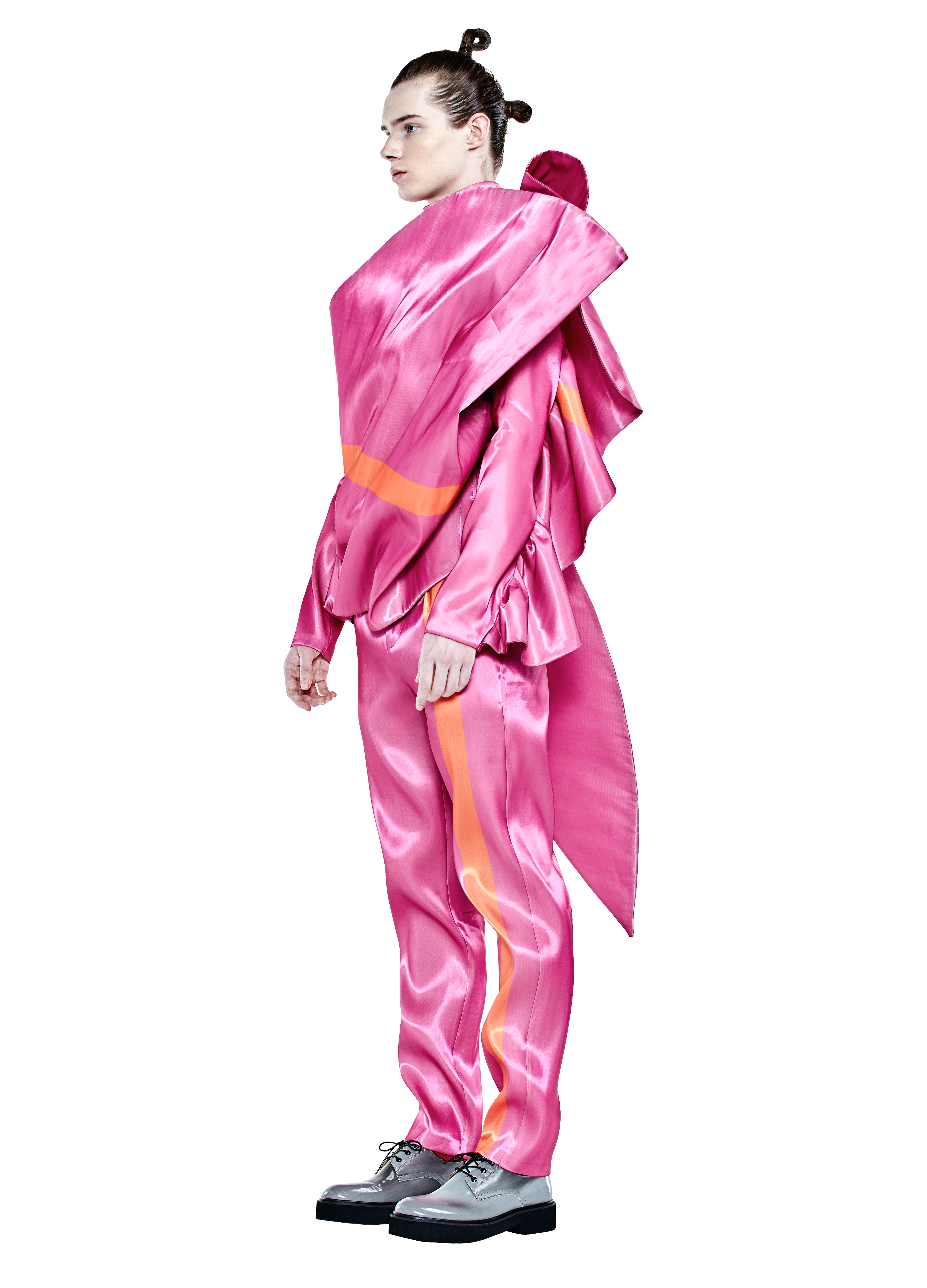 The design methodology uses the stripe as a metaphor related to the boundaries of what we perceive to be masculine or feminine; not the straight line we assume. This stripe cuts through clothing to trace spatial boundaries between cloth and body. The pattern cutting takes the stripe through and around the body with the technical challenge of juxtaposing the grain line; all cloth in this collection is printed with the foundation colour and the stripe.