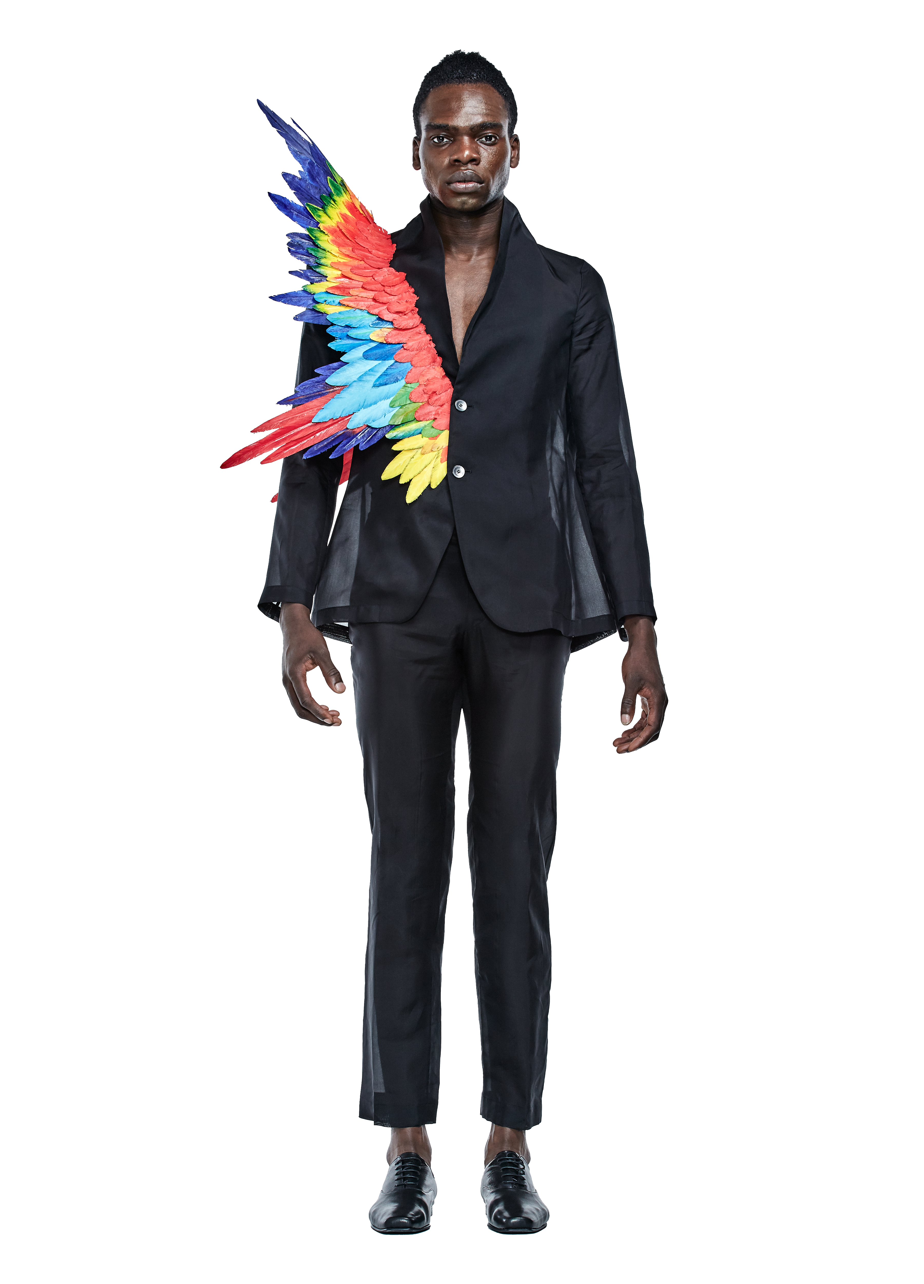 The project is based on a migration of gender in the context of couture and resulting surrealism. The analysis was undertaken into key signifiers of couture iconography and translated through cut, silhouette, colour and the craft of making for the male form. The collection employs a sustainable approach to modular feathered attachments.