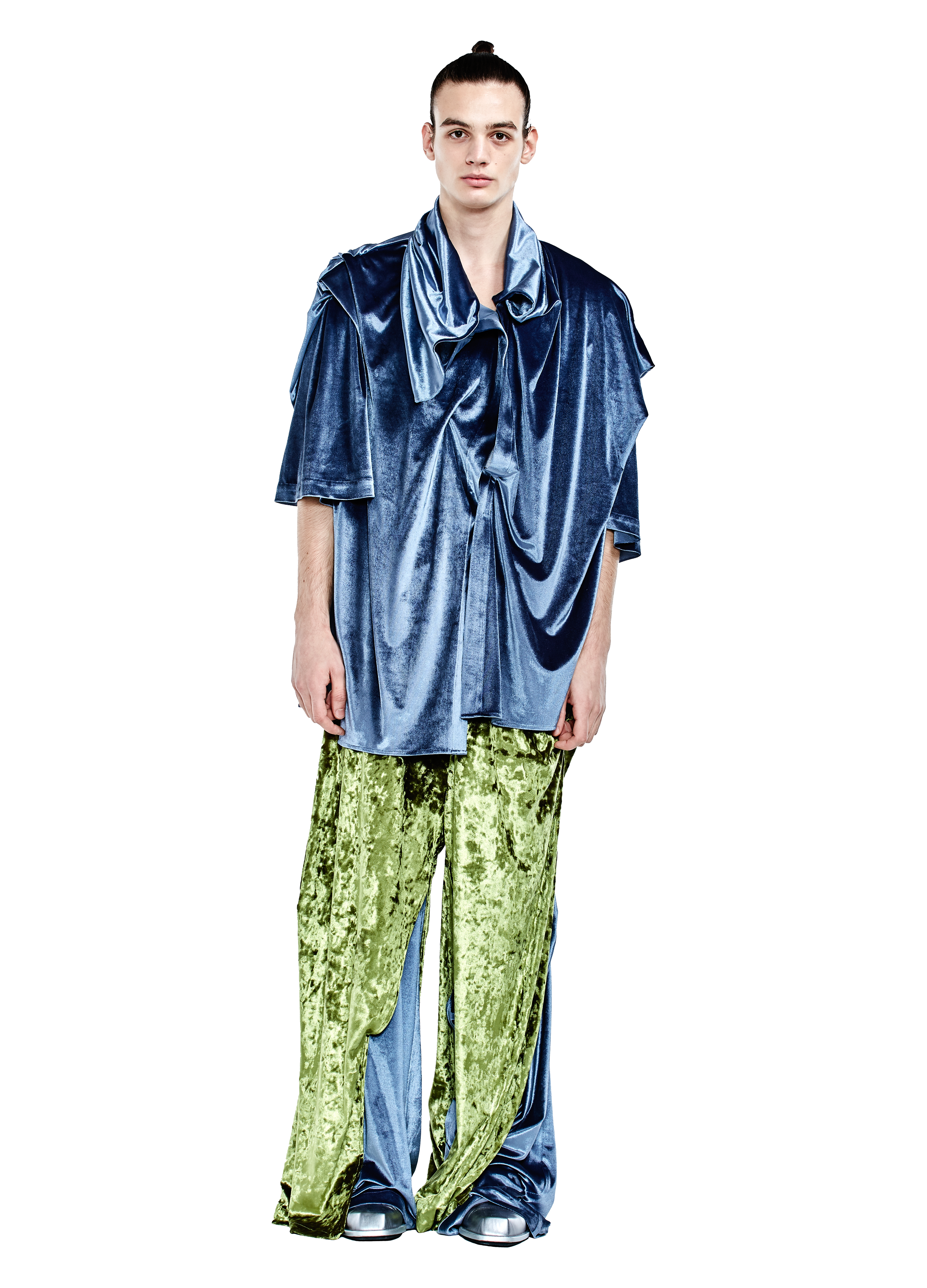 Reflected, suspended and multifunctional are three words that describe the use of ‘control' in this collection. In this project, a pattern cutting foundation is created with extensive experiments in layering further foundations for multiple ways of dressing. Due to the complexities of the resulting asymmetry the method creates inadvertent drape, which is accentuated by the choice of reflective velour.