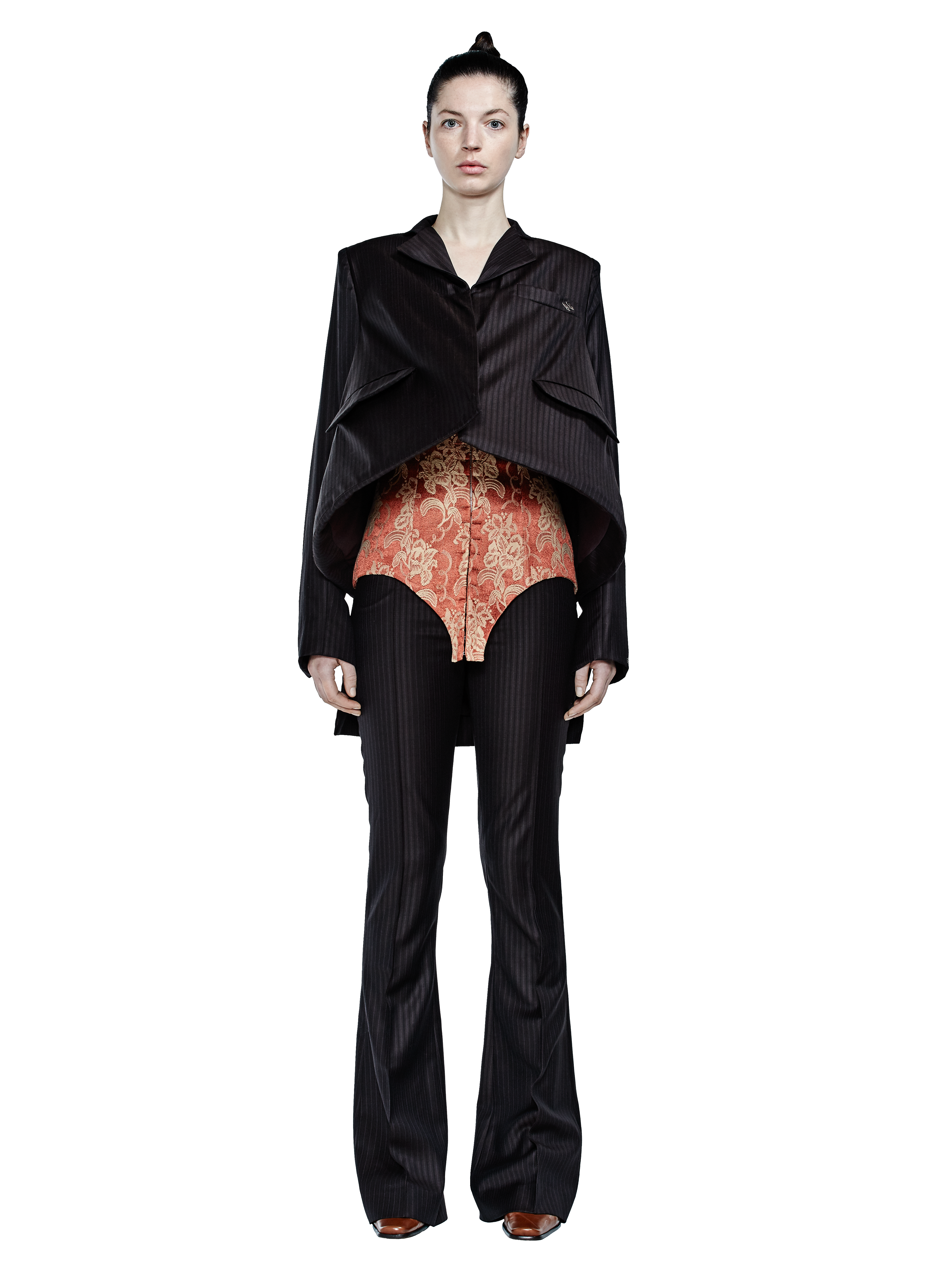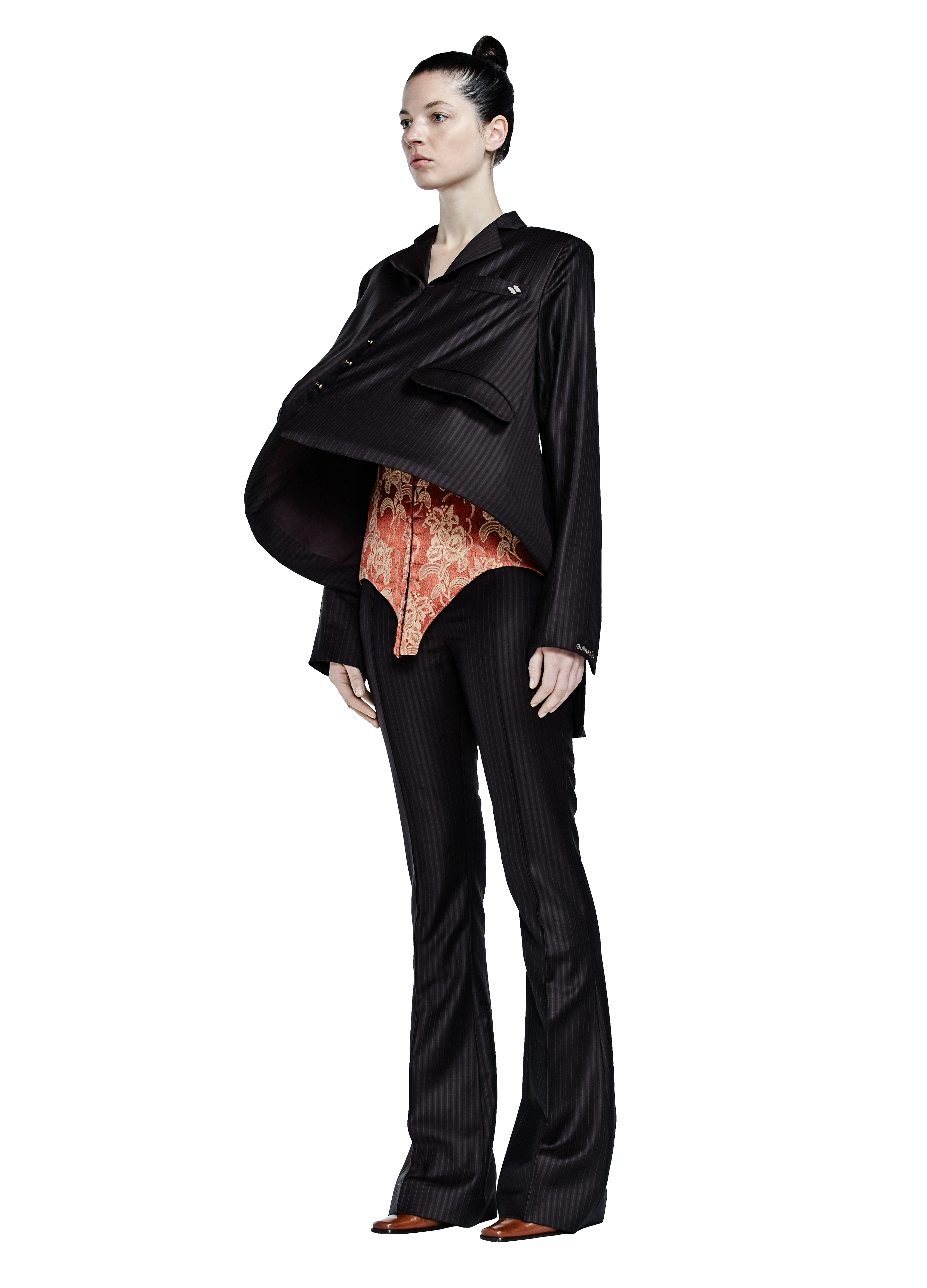 My collection is reflecting the psychological portrait of my Grand-Father through object’s symbol. I applied the Deuleuzian concept of De-Territorialization and changed the territory of objects from my grand-parent’s living room to a female body. To create wearable objects, I pushed the limits of tailoring with corsetry and millinery materials, promoted craft and investigated sustainability issues throw my leather research and proposed an innovative 3d pen used mix with crystal resin on lace.